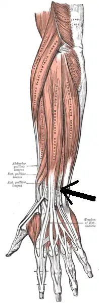 Se află imediat sub piele, medial de mușchiul extensor al degetelor (Musculus extensor digitorum) și lateral față de mușchiul extensor ulnar al carpului (Musculus extensor carpi ulnaris).