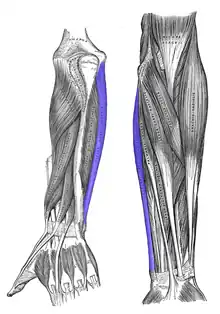 Este un puternic flexor, dar în special adductor al mâinii pe antebraț. Flexor secundar al antebrațului pe braț.