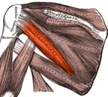 Este un rotator lateral (în afară) al brațului, ca și infraspinosul.