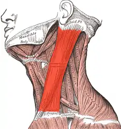Mușchiul este învelit de o teacă fibroasă , rezultată din dedublararea unei lame superficiale a fasciei cervicale. Superficial în partea lui superioară, este acoperit de țesutul subcutanat și de piele, iar în partea inferioară lui, de mușchiul platysma. Între cei doi mușchi se află majoritatea ramurilor subcutanate ale plexului cervical și vena jugulară externă.