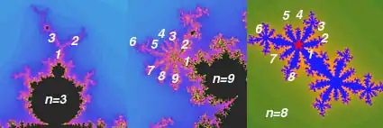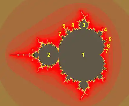 Acest bulb se numește bulbul al mulțimii lui Mandelbrot. Este format din acei parametri care au un ciclu de atracție de perioadă și număr de rotație combinatoric . Mai exact, toate componentele Fatou de perioadă conținând ciclul de atracție se ating într-un punct comun (denumit uzual punctul fix ). Dacă etichetăm aceste componente în sens trigonometric, atunci mapează componenta la componenta .