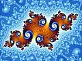 • Pasul 14: La prima vedere, aceste insule par a fi formate dintr-un număr infinit de părți, precum mulțimile Cantor, așa cum se întâmplă în cazul mulțimilor Julia Jc corespunzătoare. Aici sunt conectate prin structuri minuscule astfel încât întregul reprezintă o mulțime simplu conexă. Aceste structuri mici se întâlnesc la un satelit central care este prea mic pentru a putea fi observat la această rezoluție. Valoarea lui c pentru Jc corespunzătoare nu este cea a centrului imaginii, ci are relativ la corpul principal al mulțimii lui Mandelbrot aceeași poziție ca și centrul acestei imagini în relație cu satelitul din imaginea de la pasul 7.