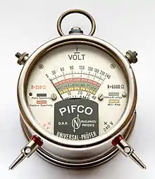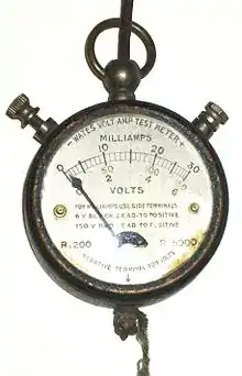 Aparatele de tip ceas de buzunar au fost utilizate pe scară largă în anii 1920. Carcasa metalică se conecta de obicei la borna negativă, aranjament care a provocat numeroase accidente cu electrocutare. Specificațiile tehnice ale acestor dispozitive erau adesea rudimentare, de exemplu cel ilustrat are o rezistență(d) de doar 25 Ω/V, o scară neliniară(d) și îi lipsește ajustarea nulului pe ambele game.