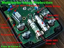 Multimetrele de bună calitate proiectate să îndeplinească standardele de Categoria II și superioare includ siguranțe ceramice cu capacitate ridicată de rupere (HRC) de obicei evaluate la mai mult de 20 kA capacitate; acestea sunt mult mai puțin probabil să se defecteze exploziv decât siguranțele de sticlă mai obișnuite. Acestea vor include, de asemenea, protecție la supratensiune de înaltă energie MOV (Metal Oxide Varistor(d)) și protecție la supracurent a circuitului sub forma unui Polyswitch(d).