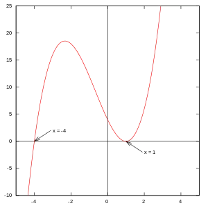 Graficul unei funcții polinomiale f atinge axa x la rădăcinile reale ale polinomului. Graficul este tangent la acestă axă la rădăcinile multiple ale lui f și nu este tangent la rădăcinile simple. Graficul traversează axa x la rădăcinile cu multiplicitate impară și nu o traversează la rădăcinile cu multiplicitate pară.