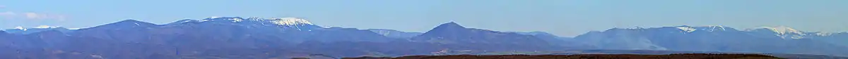 Vedere panoramică a Munților Pădurea Craiului și a Munților Bihorului din localitatea Josani, Căbești, județul Bihor în aprilie 2015. Vârful Bihor (Cucurbăta Mare), cel mai înalt din Carpații Occidentali, cu înălțimea de 1849 metri, este vizibil în colțul din dreapta sus a imaginii. Este înzăpezit și are un turn (o antena) în vârf.