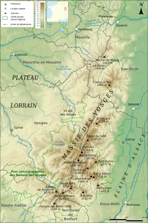 Munții Vosgi, un lanț cu lungimea de aproape 125 km și cu lățimea de până la 70 km, sunt considerați rudele apropiate ale Masivului german Pădurea Neagră, situat pe malul drept al Rinului. Cele două lanțuri muntoase se deosebesc însă din punct de vedere geologic. Gresia multicoloră, tipică pentru Munții Pădurea Neagră, poate fi întâlnită doar în regiunile mai puțin înalte din Vosgii Joși. Vosgii Înalți, unde se află cele mai înalte și mai cunoscute piscuri, și anume Grand Ballon (1.423 m), Ballon d'Alsace și Hohneck, sunt alcătuite din granit. Datorită vârfurilor lor rotunjite, sunt supranumiți „munții balon”, iar multe creste sunt botezate „baloane”[2].