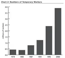 - În Statele Unite, înlocuirea treptată a lucrătorilor cu lucrători temporari a determinat ca milioane de lucrători să fie angajați în locuri de muncă temporare cu salarii mici. [3]
