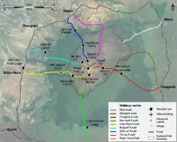 Cel mai uzual traseu porneste de la poarta Naro Moru de la altitudinea de aproximativ 2500m. In prima zi se urcă până la "stația meteo" la altitudinea de 3050m. Până aici traseul urmează un drum forestier ce traversează pădurea tropicală.