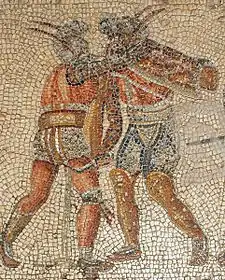Murmillo (stânga) luptând cu un Thrax (trac, în dreapta). Mozaicul de la Zliten, Libia