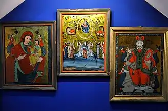 Sunt expuse numeroase icoane din secolul XVIII, atribuite pictorilor: Radu Munteanu din Ungureni, Alexandru Ponehalschi, Nechita Zugravu, Popa Ivan din Rășinari, Andrei din Cornești, Iacov din Rășinari, Ștefan Popa, Gheorghe fiul lui Iacov, Tudor Zugravul, David de la Curtea de Argeș.