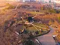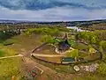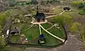 ![]() Vedere aeriană a muzeului cu biserica de lemn adusă de la Hirișeni (în prim-plan). | |