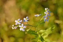 - Florile (caliciu cu 5 dinți, egali, alpit-păros, corolă cu diviziuni ovale, cu diametru de circa 8 milimetri, stilul nu depășește lungimea caliciului) sunt albastre-deschis cu gâtul alb, pe un penduncul fără bractee.[1].
