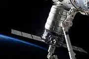 Dezvoltarea vehiculelor Commercial Resupply Services (CRS) a început în 2006 cu scopul de a crea vehicule americane de transport încărcătură fără echipaj, care să funcționeze comercial, pentru a deservi ISS.[82] La 23 decembrie 2008, NASA a acordat contracte de servicii comerciale către SpaceX și Orbital Sciences Corporation.[83] SpaceX utilizează racheta Falcon 9 și nava spațială Dragon.[84] Orbital Sciences utilizează racheta Antares și nava Cygnus. Prima misiune Dragon de reaprovizionare a avut loc în mai 2012,[85] în timp ce prima misiune de reaprovizionare Cygnus a avut loc în septembrie 2013.[86]