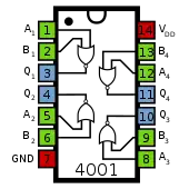 Circuitul integrat standard, seria 4000, CMOS este 4001, care include patru porți independente cu două intrări.