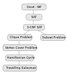 La dreapta este o diagramă cu unele dintre probleme și reducerile folosite de obicei pentru a le demonstra NP-completitudinea. În această diagramă, o săgeată de la o problemă la alta indică direcția de reducere. Această diagramă este însă înșelătoare ca descriere a relației matematice dintre aceste probleme, deoarece există o reducere în timp polinomial între oricare două probleme NP-complete; dar se indică aici doar acolo unde demonstrația acestei reduceri în timp polinomial a fost mai simplă.