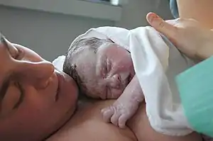 ![]() Nou-născut și mamă. Observați vernix care acoperă copilul. | |