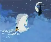 În timp ce Aku incendiază Orașul Imperial, dintre nori răzbate o lumină și o spumă lăptoasă din care se întrupează un cal alb cu opt picioare, ca cel al vikingului mesianic din spațiul intergalactic. Calul îl eliberează pe Împărat și îl poartă către o peșteră dintr-un munte de dincolo de nori.