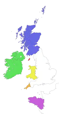 | Cymru | limba galeză (Cymraeg) | Galezi | 3.000.000 | > 750 000 (> 25%) | |