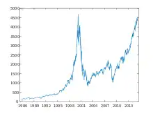 Nivelul maxim istoric, mai mult de 4700 puncte, a fost atins în anul 2000 pe fundalul dotcom.[4]