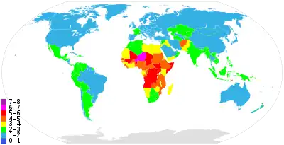 - indicele sintetic al fecundității (numărul mediu de copii născuți de o femeie în timpul vietii) variază intre valori mai mari de 7 - în câteva state din Africa Subsahariană - și 1,2 în unele state ale Europei de Est). Valoarea de 2,1 din urmă pentru acest indicator este considerată limita până la care o populație își asigură înlocuirea. Sub acest prag indică tendințe regresive, iar peste această valoare indică o creștere naturală a populației în condițiile unei mortalități reduse.