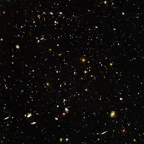 Se crede că componentele vizibile ale Universului compun doar 4,9 % din masa totală. Se crede că restul constă din materie întunecată rece 26,8 % și energie întunecată 68,3 %.[83] Proporția exactă a acestor componente este încă necunoscută și este în curs de investigare intensă de către fizicieni.