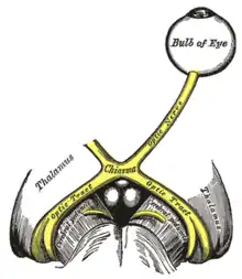 Primul neuron al căii optice (neuronii bipolari) preia informația de la receptori (celulele cu conuri și bastonașe). Axonii neuronilor multipolari (deutoneuronii căii optice) converg, formând nervul optic. Acesta părăsește globul ocular prin pata oarbă, iar axonii proveniți din câmpul intern al retinei se încrucișează, formând chiasma optică, ajungând în tractul optic opus. [2]