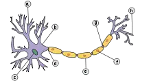 - Teaca de mielină : mielina este substanță bogată în lipide (aproximativ 85% din masa uscată) din care cele mai caracteristice (fără însă a fi prezente exclusiv în componența mielinei) sunt cerebrozidele (în special galactozil-ceramida)[11]. Teaca de mielină aderă intim la axolema și are rol de izolator electric. Ea prezintă întreruperi cu intervale regulate reprezentând situs-urile de propagare ”saltatorie” a potențialului de acțiune prin acest tip de neuroni, numite nodurile lui Ranvier.