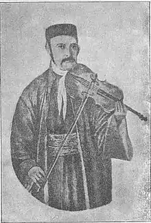 ![]() Lăutarul bucovinean Nicolae Picu în tradiționalul port din prima jumătate a veacului al XIX-lea. | |