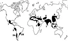 1. America Centrală, 2. America de Sud, 3. Mediteranean, 4. Persană, 5. Abisiniană, 6. Asia Centrală, 7. Indostană, 7A. Indoneziană-indochineză, 8. Sino-japoneză.