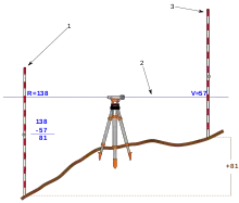 - în cazul nivelmentului geometric de mijloc se face stație cu nivela la mijlocul aliniamentului dintre punctele 1 și 3. Dh va fi egal cu valoarea citită pe miră din puncul 1 minus valoarea citită pe miră din punctul 3.
