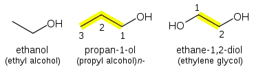 Alcoolii se denumesc cu ajutorul sufixului -ol, și este necesară menționarea poziției grupei hidroxil cu ajutorul numerelor (excepție face etanolul): CH3CH2CH2OH se denumește 1-propanol sau propan-1-ol.[11] Sufixele -diol, -triol, -tetraol, etc., sunt utilizate când sunt grefate mai multe grupe -OH: CH2OHCH2OH se denumește 1,2-etandiol sau etan-1,2-diol (etilenglicol).
