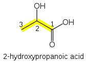 Dacă pe catenă sunt prezente grupe funcționale cu prioritate mai mare, atunci se folosește în schimb prefixul hidroxi-: CH3CHOHCOOH se denumește acid 2-hidroxipropanoic (acid lactic).