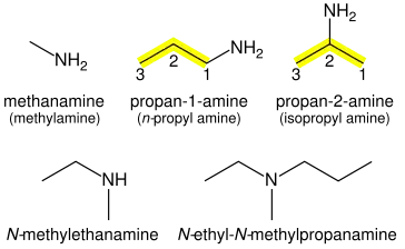 Pentru aminele secundare (R-NH2), cea mai lungă catenă care se leagă de atomul de azot devine numele primar al aminei, iar cealaltă catenă se indică printr-un prefix, alături de litera N scrisă cursiv: CH3NHCH2CH3 se denumește N-metiletanamină. Aceeași metodă se aplică și pentru aminele terțiare (R-NR-R): CH3CH2N(CH3)CH2CH2CH3 se denumește N-etil-N-metilpropanamină. Și de această dată trebuie luat în considerare faptul că grupele substituent sunt ordonate alfabetic.