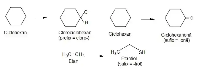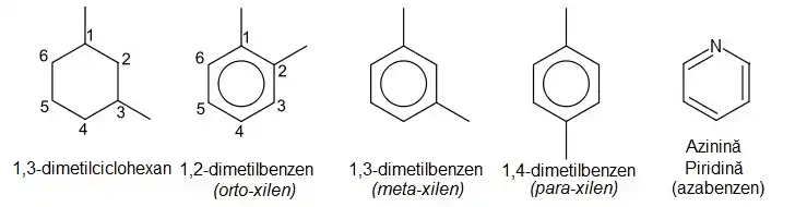 Cicloalcan și compușii aromatici (arenele, heteroarenele, etc) pot fi adesea considerați catenă principală a unui compus, caz în care pozițiile substituenților sunt numerotate în jurul structurii nucleare. De exemplu, cei trei izomeri ai xilenului, CH3C6H4CH3, sunt denumiți orto-, meta- și para-, sau în mod asemănător 1,2-dimetilbenzen, 1,3-1,2-dimetilbenzen și respectiv 1,4-1,2-dimetilbenzen. Exemple de cicloalcani sunt ciclopropan, ciclohexan. Structurile ciclice pot fi tratate și ca grupe funcționale, caz în care prefixul folosit este de forma cicloalchil- (ciclohexil, ciclopentil). Există și denumiri speciale ale resturilor: cel provenit de la benzen este fenil, iar cel provenit de la toluen este benzil.