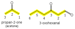 În cazul în care este necesară folosirea unui prefix, din cauza priorității, atunci se folosește forma oxo-, ca și în cazul cetonelor: CHOCH2COOH se denumește acid 3-oxopropanoic. Dacă atomul de carbon din grupa carbonil nu poate fi inclus în denumirea catenei principale (cum este, de pildă, în cazul aldehidelor ciclice sau aromatice), se folosește prefixul formil- sau sufixul -carbaldehidă: C6H11CHO se denumește ciclohexancarbaldehidă, iar C6H5CHO se denumește benzencarbaldehidă (benzaldehidă).[11]