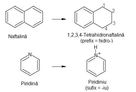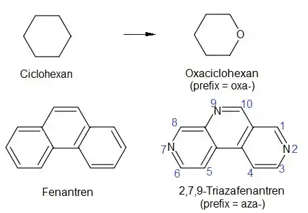 - - prefixe speciale care fac referire la atomul care a înlocuit atomul de carbon, acestea terminându-se în -a (aza pentru azot, tia pentru sulf).