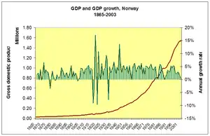 Țara își menține o combinație de economie de piață și stat pe model socialist nordic(d), unde există un sistem sanitar universal(d) și sistem de asistență socială cuprinzătoare. Norvegia are vaste rezerve de petrol, gaze naturale, minereuri, cherestea, fructe de mare, apă dulce, și hidroenergie. Industria petrolieră reprezintă aproximativ un sfert din produsul intern brut (PIB) al Țării.[7] Pe cap de locuitor(d), Norvegia este cel mai mare producător mondial de petrol și gaze naturale în afara Orientului Mijlociu.[8][9]
