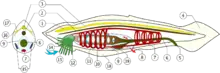 1 - veziculă ventrală (ventricul) a tubului nervos; 2 - notocord (coardă); 3 - tub neural (neurocel); 4 - înotătoare codală; 5 - anus; 6 - intestin posterior; 7 - sistem circulator; 8 - atriopor; 9 - endostil; 10 - fantă branhială; 11 - faringe; 12 - cavitate bucală; 13 - ciri; 14 - velum; 15 - gonadă (ovar, testicul); 16 - ocelii lui Hesse; 17 - nervi; 18 - metapleure; 19 - cecum hepatic