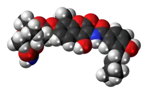 Novobiocina este un antibiotic de tip aminocumarinic care este utilizat în tratamentul infecțiilor bacteriene stafilococice.[9][10] Prezintă activitate și pe stafilococul auriu meticilino-rezistent (MRSA).[11] Molecula sa a fost descoperită la mijlocul anilor 1950 și denumită streptonivicină, datorită faptului că a fost produsă de către actinomiceta Streptomyces niveus.[12][13]