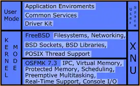 După ce Apple a procurat NeXT, componenta Mach a fost actualizată la OSFMK 7.3,[7] care e un micronucleu.[8] Apple utilizează un OSFMK 7.3 modificat substanțial care funcționează ca un nucleu hibrid cu părți din FreeBSD incluse.[7] (OSFMK 7.3 include cod aplicabil din nucleul Mach 4 al Universității Utah și cod aplicabil din multe variante Mach 3.0 care au apărut din nucleul Mach 3.0 original al universității Carnegie Mellon.) Componentele BSD au fost actualizate cu cod din proiectul FreeBSD și Driver Kit a fost înlocuit cu un API C++ pentru a scri drivere numit I/O Kit.