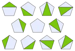 - Al n-lea număr din șir indică numărul de fețe din toate dimensiunile ale unui asociaedru Kn + 1 de dimensiunea n − 1, incluzând asociaedrul însuși ca față, dar fără a include [[mulțime vidă |mulțimea vidă. De exemplu, asociaedrul bidimensional K4 este un pentagon; are cinci vârfuri, cinci fețe și poligonul însuși, în total 11 fețe.