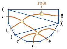 Așa cum se vede în figură, există o echivalență combinatorie simplă între aceste obiecte: o subdiviziune a poligonului are un arbore planar ca formă a grafului dual al acestuia, frunzele arborelui corespund simbolurilor dintr-o secvență dintre paranteze iar nodurile interne ale arborelui, altele decât rădăcina, corespund grupurilor dintre paranteze. Secvența dintre paranteze însăși poate fi înscrisă în jurul perimetrului poligonului cu simbolurile sale pe laturile poligonului și cu parantezele la capetele coardelor selectate. Această echivalență oferă o demonstrație bijectivă că toate aceste tipuri de obiecte sunt contorizate de un singur șir de întregi.[4]