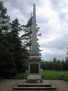 Monumentul a apărut în Parcul Ecaterina într-o perioadă în care, prin eforturile arhitectului Vasili Ivanovici Neiolov și a maestrului grădinii I. Buș s-a creat partea peisagistică[6][10] și s-a hotărât să se lase neschimbată panta blândă a dealului de la sud de Palatul Ecaterina. Astfel monumentul a ajuns în centrul unei lunci largi și verzi care se ridică de-a lungul pantei dealului.[11][6] Această poiană, amenajată în 1771, s-a numit cea Mare[8][10] și se întindea pe o distanță de peste 200 de metri, cu poteci pe lateral.[12] I. F. Iakovkin scria în 1830 în ghidul său despre Țarskoe Selo că era interzisă apropierea de obelisc, stând în mijlocul pajiștii, „pentru a nu călca gazonul”.[8]