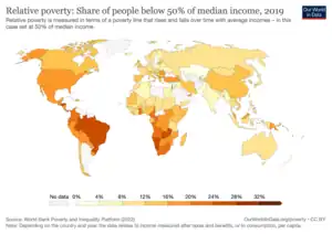 Sărăcia relativă și inegalitatea reprezintă ponderea persoanelor care trăiesc sub 50% din nivelul veniturilor mediane. Datele din 110 țări cu venituri ridicate și mici au arătat că media națională însemna 14% din populație cu niveluri de venit sub acel prag. Dar atât țările bogate, cât și cele sărace au niveluri ridicate și scăzute de inegalitate. Inegalitatea veniturilor nu este strâns corelată nici cu sărăcia, nici cu bunăstarea, ceea ce sugerează că politicile care promovează egalitatea și incluziunea au relevanță universală[6].
