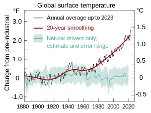 Multe efecte ale schimbărilor climatice sunt deja resimțite la nivelul actual al creșterii temperaturii globale cu 1,2°C. Încălzirea suplimentară va crește impactul acestora și poate depăși pragul de reversibilitate, ducând spre exemplu la topirea calotei polare din Groenlanda[9]. Conform Acordului de la Paris din 2015, națiunile au convenit să mențină încălzirea „cu mult sub 2°C”. Cu toate acestea, luând în considerare angajamentele făcute în temeiul Acordului, încălzirea globală va crește în continuare cu aproximativ 2,7°C până la sfârșitul secolului[10]. Începând cu 2020, multe țări au trecut la punerea în aplicare a planurilor naționale de adaptare la schimbările climatice[11]:15.