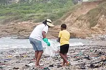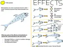 Oceanele sunt poluate de particule de plastic de dimensiuni variate, de la materiale de dimensiuni mari, cum ar fi bidoane și pungi, până la microplasticele formate din fragmentarea materialului plastic orginal. Aceste reziduuri sunt foarte lent degradate sau îndepărtate din ocean, astfel încât particulele de plastic sunt răspândite pe toată suprafața oceanului iar efectele lor dăunătoare asupra vieții marine sunt bine cunoscute[33]. Pungile de plastic, resturile de ambalaj, mucurile de țigară și alte forme de deșeuri de plastic care sunt deversate în ocean prezintă pericole pentru fauna marină și pentru pescuit[34]. Fauna acvatică este amenințată de încurcare, sufocare sau ingerare[35][36]. Plasele de pescuit, confecționate de obicei din material plastic, pot fi abandonate sau pierdute în ocean de către pescari, reprezentând o amenințare pentru pești, delfini, broaște țestoase, rechini, dugong, crocodili, păsări marine, crabi și alte vietăți, blocându-le mișcările, provocând înfometare, răni, infecții sau, în cazul celor care trebuie să revină la suprafață pentru a respira, sufocare[37]. Există diferite tipuri de plastic oceanic care cauzează probleme vieții marine. S-au găsit capace de plastic în stomacul țestoaselor și păsărilor marine, care au murit din cauza blocajului căilor respiratorii sau digestive[38]. Plasele fantomă sunt, de asemenea, un tip problematic de plastic oceanic, deoarece pot reține permanent și continuu vietățile marine, într-un proces cunoscut sub numele de „pescuit fantomă”[39].