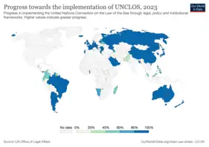 Un raport din 2021 a afirmat că: „numeroase state au ratificat sau au aderat la Convenția Națiunilor Unite privind dreptul mării (168 de țări) și acordurile sale de punere în aplicare (150 de țări au semnat Acordul privind punerea în aplicare a părții a XI-a a Convenției Națiunilor Unite privind dreptul mării și 91 de țări au semnat Acordul Națiunilor Unite privind stocurile de pește)"[22].