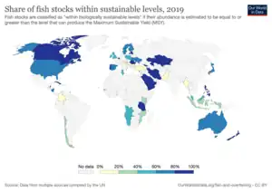 Un raport prezentat la Forumul politic la nivel înalt pentru dezvoltare durabilă din 2021 a afirmat că: „Pescuitul durabil a reprezentat aproximativ 0,1% din PIB-ul global în 2017”[52]. Raportul de progres al Națiunilor Unite afirmă că peste 35,4% din stocurile globale au fost supraexploatate în 2019, o creștere de 1,2% față de 2017. Cu toate acestea, rata declinului a scăzut în ultimii ani, deși tendința continuă să scadă față de obiectivul din 2020, care vizează restabilirea stocurilor de pește la niveluri durabile[21].
