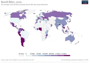 Se estimează că în oceane exista un stoc de 86 de milioane de tone de reziduuri marine din plastic la sfârșitul anului 2013, presupunând că 1,4% din plasticul global produs între 1950 și 2013 a ajuns în ocean și s-a acumulat acolo[26]. „Consumul” global de materiale plastice este estimat la 300 de milioane de tone pe an începând cu 2022, aproximativ 8 milioane de tone ajungând în oceane ca macroplastice[27][28]. Aproximativ 1,5 milioane de tone de microplastice primare ajung în mări. Aproximativ 98% din această cantitate rezultă în urma activităților terestre, restul de 2% fiind generat de activitățile de pe mare[28][29][30]. Se estimează că 19-23 de milioane de tone de plastic pătrund anual în ecosistemele acvatice[31]. Conferința Națiunilor Unite privind Oceanul din 2017 a estimat că, în anul 2050, în oceane s-ar putea găsi o cantitate mai mare de plastic decât de pește[32].